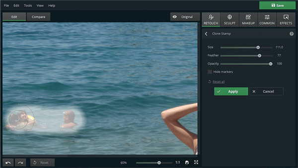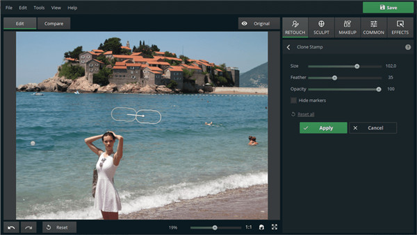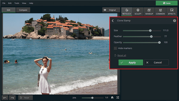 在“修饰”选项卡下,找到“复制图章”工具并将其选中。它将帮助您为照片中不需要的人创建无缝的补丁。设置工具的大小,以使其分散注意力,羽毛设置使笔刷边缘更柔和