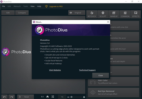 PhotoDiva是一款免费的照片编辑器,它使用AI分析图像并检测面部特征(眼睛,鼻子,嘴唇等)。这就是为什么它可以自动修复皱纹而又不会使照片中的脸孔变形的原因。PhotoDiva的修饰预设可立即掩盖细纹-有时会同时出现毛孔粗大,油腻光泽和其他瑕疵。更深的皱纹需要更精确的方法和手动校正,但是该程序的智能编辑工具将帮助您完美修复它们