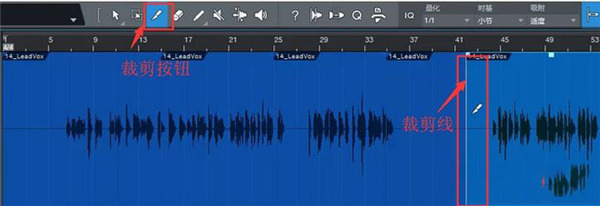 裁剪工具位于Studio One工具栏左数第三个位置。点击按钮选中裁剪工具,此时鼠标的作用相当于剪刀。