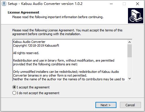 2、双击KabuuAudioConverter1.0.2.exe,并依据提示进行安装,勾选同意安装协议