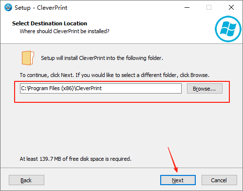 3、选择Abelssoft CleverPrint安装路径,默认路径为C:\Program Files (x86)\CleverPrint,可默认或点击“Browse”更换安装路径,完成点击Next
