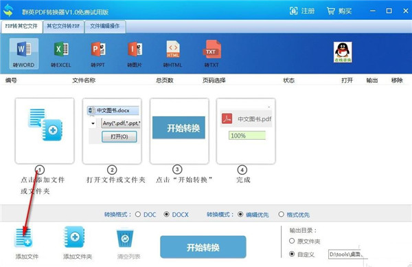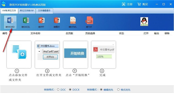 群英PDF转换器是由群英软件推出的一款新型的PDF文件转换工具,支持将PDF文件转换成WORD、EXCEL、PPT、图片、HTML、TXT等各类文件,操作简单,你只需把PDF文件拖拽到软件界面中,然后单击转换即可完成转换。具备批量PDF文件转换功能也是群英PDF转换器的一大特色功能之一。经过不断地优化与升级,目前群英PDF转换器已经成功地实现了基于超线程技术的PDF文件批量转换技术,多个PDF文件实现批量一键转换,轻松快捷,功能强大、界面简洁。群英pdf转换器是一款可以对pdf文件进行多格式转化的工具,如果您想把某个PDF文件转化为JPG,WORD,PPT等其他格式,使用这款免费的群英PDF转换器可以让你感受便捷操作带来的精神快感。有需求的朋友请下载体验!