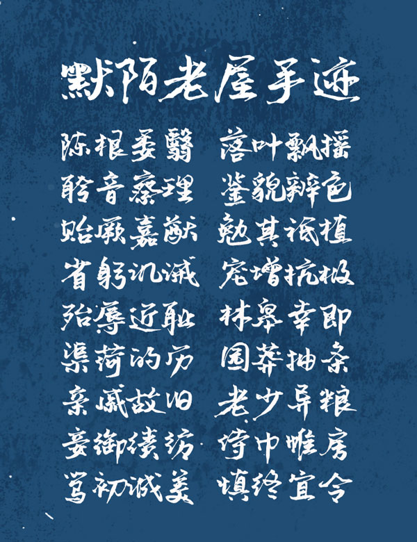 默陌老屋手迹字体是一款非常好看的毛笔字体。该字体线条非常粗壮,其笔画遒劲灵动,连笔张弛有度,整体效果非常统一,粗犷的线条和舒展的造型赋予字体俊秀多姿的色彩。且字库完整,能够应用于文本装潢、信息展示、网页设计、篆刻制模、数据制作、装潢设计、计算艺术设计、视觉设计、字帖等一切合法应用场景。喜欢这款字体的话可以下载收藏。