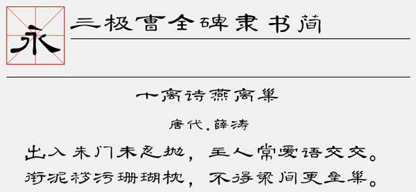 三极曹全碑隶书简字体是以曹全碑为模板的录书字体,《曹全碑》属东汉末隶书完全成熟期的代表作品之一,它记载了东汉末年曹全镇压黄巾起义的事件,是研究东汉末年农民起义重要的历史资料,也是现存中国汉代石碑中保存比较完整、字体比较清晰的少数作品之一。其结字匀整,用笔方圆兼备,而以圆笔为主,风致翩翩,美妙多姿,是汉隶中秀美风格的代表。可以很好的应用于文本装潢、信息展示、网页设计、篆刻制模、数据制作、装潢设计、计算艺术设计、视觉设计、字帖等一切合法应用场景,有喜欢的朋友可免费下载收藏。