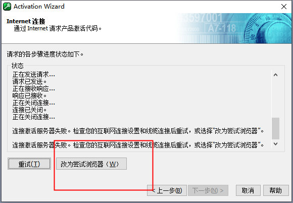 3、由于网络连接断开,系统无法验证密钥代码,这里点击“改为尝试浏览器”切换到离线激活。
