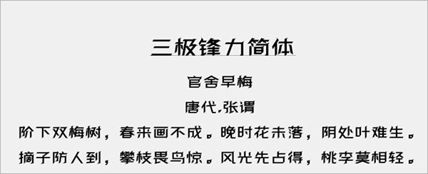 三极锋力简体字体是由三极字库推出的一款结构饱满的印刷字体,该字体整体风格清新醒目、时尚柔美,精致富有内涵。笔画设计为直线、斜线等既有方向性又有力度的线形构成的图形,工整简洁,具有强烈的视觉冲击力。横竖笔画的粗细反差较大,具有强烈的视觉冲击力;撇、捺起笔收笔统一,个性鲜明,富有朝气。适用于文本装潢、信息展示、网页设计、篆刻制模、数据制作、装潢设计、计算艺术设计、视觉设计、字帖等一切合法应用场景,有喜欢的朋友可免费下载收藏!