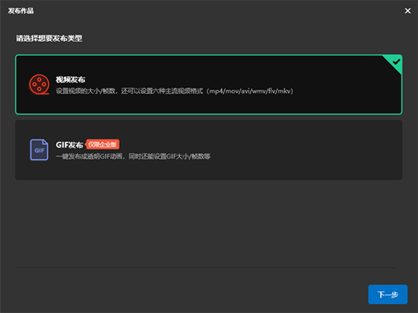 视频编辑完毕后可发布为视频格式和GIF格式。六种主流视频格式如*.mp4、*.mov、*.wmv、*.avi、*.flv、*.mkv可选,透明可循环播放GIF一键发布。