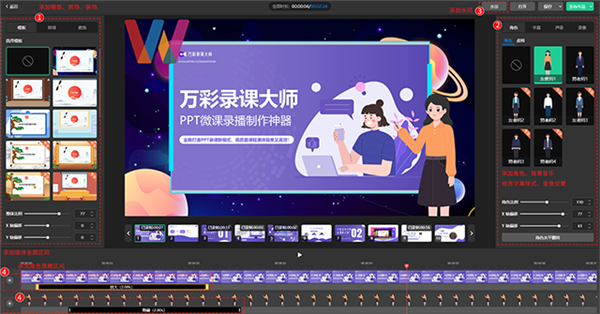 添加媒体全屏区间,在使用模板后可以放大PPT预览区域;添加角色隐藏区间,可暂时隐藏虚拟讲解人物。