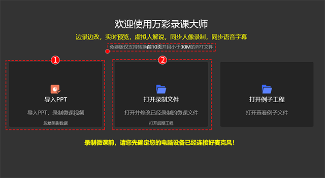 一、导入PPT 在万彩录课大师中,创建新工程有两种方法: 1、导入PPT,新建录课文件; 2、打开录制文件,打开并修改已录制的微课文件。