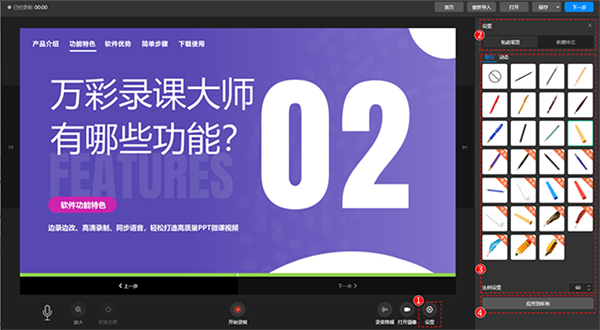 5、设置:可设置轨迹笔型、教鞭样式、点击动画效果,设置后可在录制完毕后预览效果。