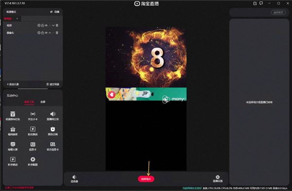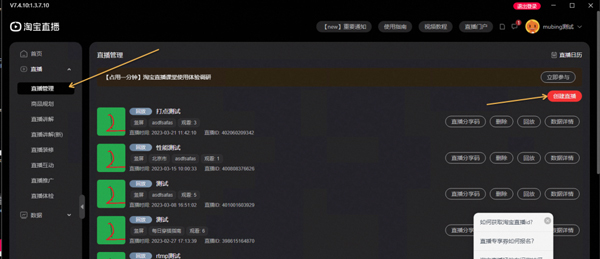 3、以上两种方式均为进入直播间,在直播间内创建直播并开播,也可以选择已经创建好的直播直接开播[选择场次]->[选择已经创建好的直播开播]/[创建新的直播并开播]