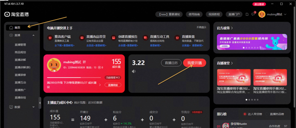 1、随时随地想播就播 在外也能发布预告/直播; 横屏竖屏随意选择; 镜像功能开关在手,是否镜像你说了算; 更大聊天区域,快速回应观众。 2、超级数据看板 更多数据,清晰了解直播间情况; 直播过程实时查看,直播结束随时回顾对比; 粉丝情况核心信息实时跟踪提醒。 3、资讯广场 快速获取主播培训资料; 官方资讯,一手掌握; 大型活动,快速报名。淘宝直播主播工作台电脑版怎么开播?