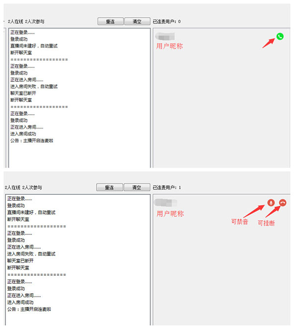 5、点击接通后,主播已接通粉丝的连线;当粉丝音质不好或暂时不需要发言时主播可点击静音按钮,此时该粉丝的发言将不会被播放,当连麦环节已结束时,主播可点击挂断按钮,结束与该粉丝的连麦