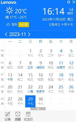 联想日历电脑版是一款非常实用的日历软件,也是一款非常优秀的电脑日历应用,能够帮助用户记录各种重要的日期。使用联想日历能够在你的电脑桌面上有着一个小框,在这个小框内有着日历、节气、天气状况、还有各种事宜。通过它你还能够进行每日的事项记事,包括行程的题型,各种纪念日的提醒。有了联想日历你再也不用怕错过时间,再也不会忘记每个月的必备事项了。总的来说这个软件还是非常实用的,如果喜欢可以下载使用!!!