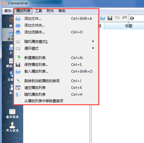 1、搜索并播放您的媒体库 2、创建智能播放列表和动态播放列表。 3、标签式播放列表,导入或导出 M3U,XSPF,PLS 和 ASX。 4、支持 CUE sheet。 5、播放音乐CD。 6、可视化效果来自 projectM. 7、歌词以及艺人的照片与简介。 8、转换音频格式至 MP3, Ogg Vorbis, Ogg Speex, FLAC 或者 AAC 9、编辑 MP3 和 OGG 文件的标签,管理您的音乐。 10、通过 MusicBrainz 获取缺失的标签。 11、发现、下载 Podcast 播客。 12、通过 Last.fm 和 Amazon 自动补全封面。 13、跨平台 - 完美运行于 Windows,Mac OS X 和 Linux。 14、原生支持 Linux (libnotify) 和 Mac OS X (Growl) 的桌面提醒。 15、远程控制功能,通过 安卓设备, Wii 遥控器, MPRIS 或者其它命令行。 16、复制您的音乐至 iPod, iPhone, MTP 或者大容量 USB 播放器。 17、队列管理器clementine中文版安装教程