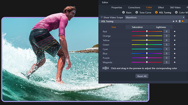 通过完整的色彩分级功能(可自定义关键帧),控制视频的氛围并设置心情。达到专业水平的主题效果,并轻松地在片段之间复制更改。色彩分级使您能够完全改变画面的感觉,将焦点吸引到场景或主体上,对剪辑的色相和亮度进行校正等等。
