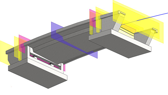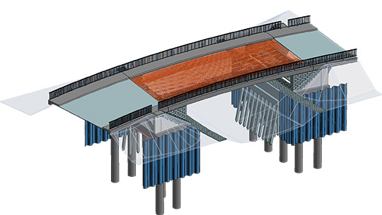 主要功能包括用于单个桥梁上部结构的自动3D / BIM规划的特殊功能,包括换辊,横截面变化,加宽和凹陷。路径和坡度数据对于复杂桥梁结构的设计非常重要,既可以通过文件导入,也可以手动输入以创建3D路径。这些是使用回旋曲线,圆弧,抛物线等自动生成的。甚至具有可变横截面的上层结构也由程序生成。桥梁轮廓的每个点可以链接到其自己的路径或3D路线。