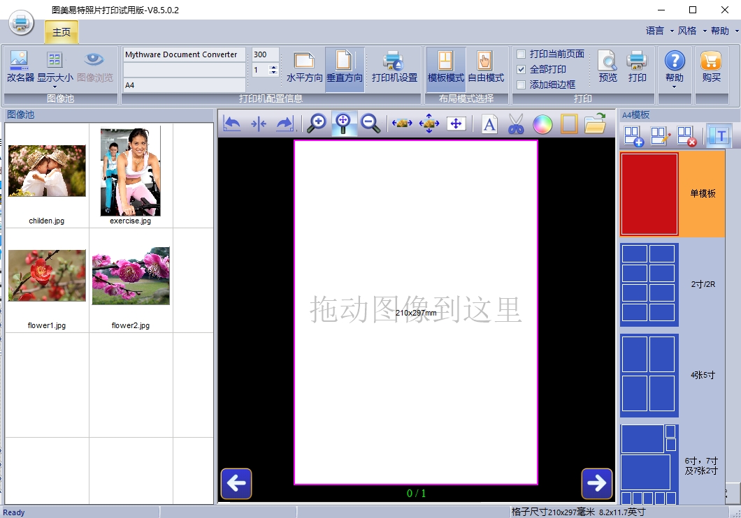 图美易特照片打印软件是一款专业的照片排版打印软件。通过软件自带的自由手动方式和模板方式在照片纸上布局各种尺寸的照片,可帮助用户实现快速打印精确尺寸照片。并且模板方式除了提供了大量的打印模板,用户还可以根据纸张大小自定义模板。当然,自由手动方式更是支持直接拖动图像到布局页面上调整位置尺寸,一张照片纸上可以轻松地布局多种打印尺寸,最大限度的利用纸张,并且一次可以布局多张页面。有需要的用户欢迎下载体验。