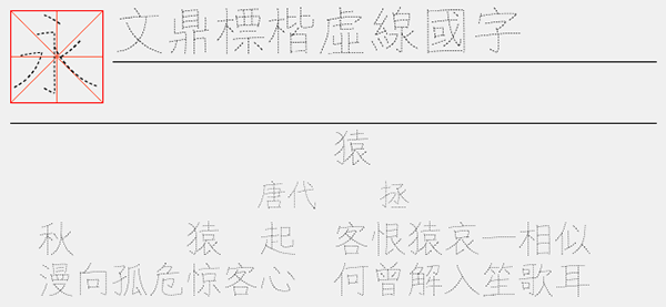 文鼎标楷虚线国字体是一款以虚线为主题的楷书字体,该字体运笔灵活,笔画生动,字形清秀俊,十分美观。并且线条做了重绘,十分细腻,除了摹字外亦可用于各种装饰,具有很好的视觉感,且字库完整,可以很好的应用于文本装潢、信息展示、网页设计、篆刻制模、数据制作、装潢设计、计算艺术设计、视觉设计、字帖等一切合法应用场景。喜欢这款字体的朋友快来下载吧!