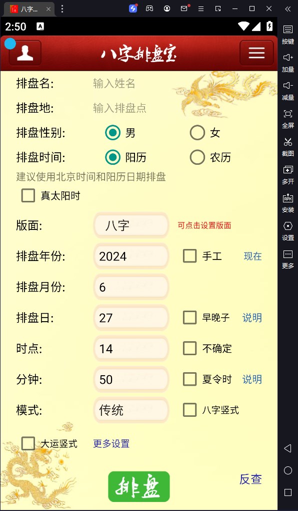 八字排盘宝电脑版是配合安卓模拟器运行在pc端的一个版本。同时也是一款出色的八字命理工具。其拥有很多实用的功能,可以帮助用户分析自己的八字命盘。可以通过八字排盘宝来预测未来的运程和注意事项,让人们更好地了解自己的命运和掌握人生。当然,需要注意的是八字排盘宝只是参考性质,终还是要把握自己的人生,脚踏实地前进才是关键。
