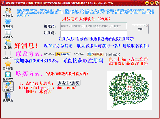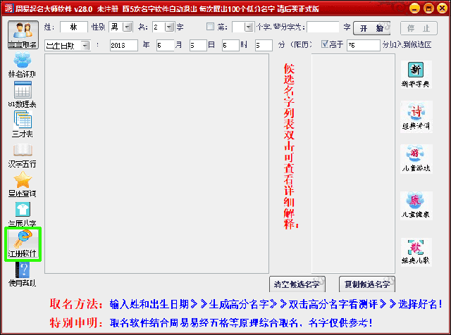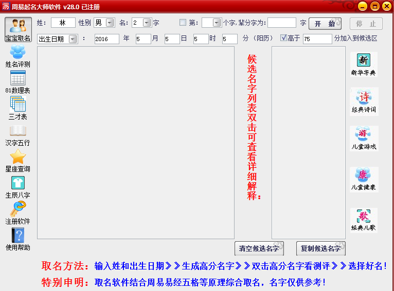 周易起名大师是一款专业的取名软件,周易起名大师参考宝宝姓氏、性别、生辰八字、天格、地格、人格、外格、总格、三才数理等因素一次可生产数千个好名字,您还可根据笔画数、拼音、五行、指定含某字等方式在输出结果里筛选出满意的名字,周易起名大师中还提供10余种方法供起名选择,比如指定取名,谐音取名,生日取名,成语取名和英文取名等等。软件除了取名功能外,还带有其他丰富多彩的功能,如查询生辰八字、生日密码、血型密码、星座分析、预产期计算等实用功