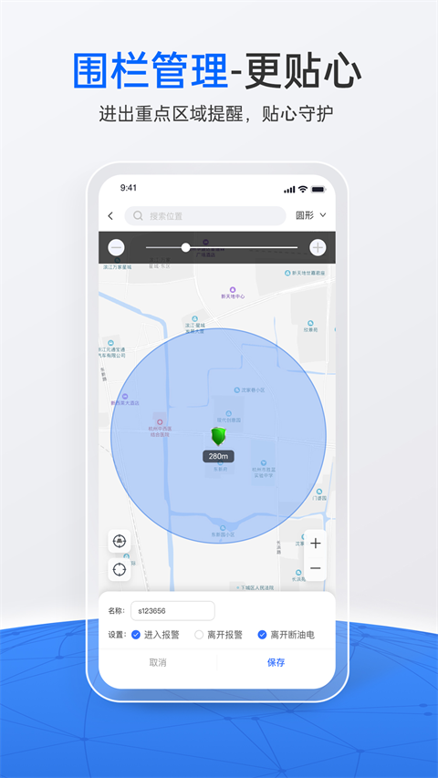 实时定位:BDS/GPS、基站、WIFI多模式实时精准定位,毫秒级获取位置信息; 状态监控:车辆启动/熄火、怠速、温度、油量等状态实时监控,让您随时掌握设备实况; 风险预警:23个维度风险预警机制,支持平台、APP、短信、电话多方式实时告警推送提醒; 轨迹回放:车辆历史轨迹数据存储在云服务器,可导出并支持随时查看; 远程控制: 远程一键下发控制指令,实现远程操控设备; 围栏管理:多种自由形式围栏限制车辆行驶区域,车辆进入/离开限定区域触发报警; 数据分析:多维度的数据统计,打造场景化的数据分析,为您决策提供数据支撑。立即定位app特色