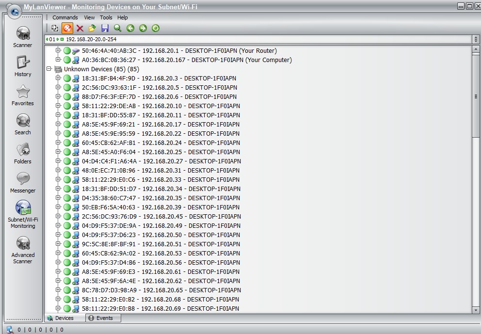 MyLanViewer官方版是一款功能强大的网络IP监视器和扫描器。它可以将用户所在的局域网中的计算机,用简单易读的列表形式显示出来,并可显示局域网中各台计算机的IP地址、MAC码地址和计算机名、共享资源以及其他详细的技术信息。MyLanViewer提供快速扫描和完整扫描模式两种扫描模式,用户在扫描之后就能获得电脑中所有的信息,包括共享文件夹和IP地址等。MyLanViewer在扫描网络IP的同时,还可监视局域网中的IP,若计算机的状态发生变化,它就会提醒用户需注意,在此过程中,用户可查看和访问共享文件夹,且可终止用户的进程。此外,它还支持远程关机、唤醒、锁定工作站和注销、睡眠、重新启动和关闭电源等远程操作,感兴趣的用户们欢迎前来本站免费下载使用。