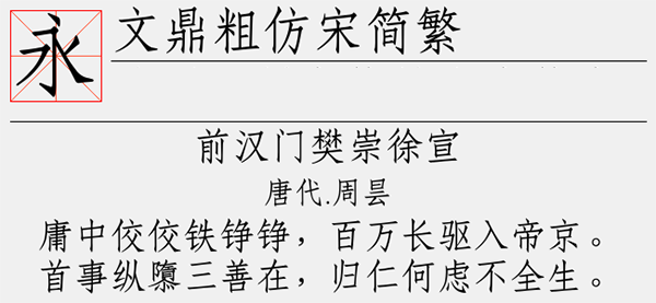 文鼎粗仿宋简繁字体是一款赏心悦目、百看不厌的中文字体,该字体线条偏细,字形效果美观!仿照宋版书上所刻的字体,笔画粗细均匀,有长、方、扁三体。也叫仿宋体,仿宋字。 方正仿宋简体,笔划粗细均匀,字型俊秀挺拔,布局严谨,错落有致。并且中英文、阿拉伯数字全面支持,可以很好的应用于文本装潢、信息展示、网页设计、篆刻制模、数据制作、装潢设计、计算艺术设计、视觉设计、字帖等一切合法应用场景,有喜欢的朋友可免费下载收藏。