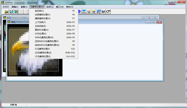 1、正负片反转 2、XOR 0x80 处理 3、RGB更换 4、GMASK(去马赛克软件)支持以下的马赛克处理 5、纵、横的玻璃样处理 6、WIN马赛克互换处理 7、FL马赛克互换处理 8、Q0马赛克互换处理 9、上下、左右的图像反转 10、MEKO马赛克互换处理 11、CP马赛克互换处理gmask怎么去除马赛克教程?