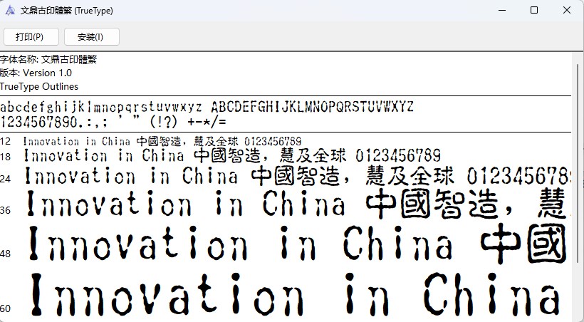 文鼎古印体繁体字体是一款个性化鲜明的印章体,该字体模仿古代繁体字的印章字形,笔锋圆润。由于模仿印章体,所以笔顺不是很连贯,尤其是英文字体,更有一种可爱的艺术感。适用于广告创意、包装设计、平面杂志等创意性需求的方面。
