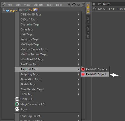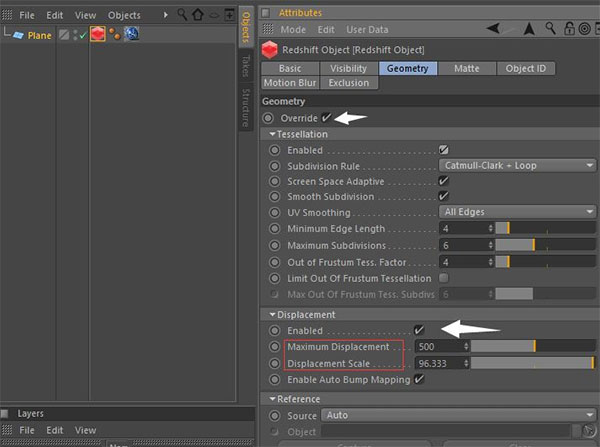 将材质应用到plane,并添加Redshift Object标签以应用displacement;