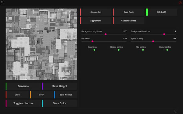 1、置换贴图生成器。 2、支持8192×8192 PNG输出 3、支持自定义精灵 4、用于制作alpha / light贴图的生成器。 5、彩色贴图制作者(有几个选项。更多即将推出!) 6、支持法线贴图导出!功能介绍