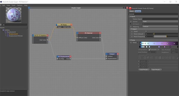 新建Redshift材质,打开材质编辑器。拖入贴图,搜索并添加Ramp,Displacement,关系连接如下图