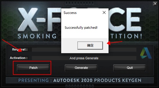 13、这时以管理员身份运行软件包中的“xf-adesk20_v2.exe”文件打开revit2021注册机,首先一定要先点击patch,弹出“successfully patched”才能进行下一步;