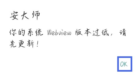 1、如果大家进入安大师app,提示系统Webview版本过低,点击【OK】前往更新。