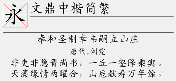 文鼎中楷简繁字体是一款百看不厌、赏心悦目的简繁楷书字体,该字体是比较常用的,笔画略粗,非常的霸气,同时该字体的角度、大小、距离都设计得非常恰当,整体效果极佳。字体以浓浓的笔墨和传统的楷体,深受广泛用户的喜爱,再配上多元化的行书风格,更是使其充满设计感。可以适应于报纸和杂志和书籍中常用字体海报、个性促进品牌标志设计、字体设计、文本装潢、信息展示、篆刻制模英文、数据制作、装潢设计、视觉设计、字帖等一切合法应用场景,有喜欢的朋友可免费下载收藏。