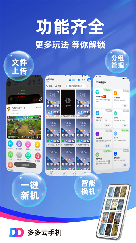 1、性能强劲云端手机可无限的多开 2、多多云手机提供多至的手游辅助功能24小时游戏在线 3、手游托管自动的游戏运行解放你的双手 4、完美的适配全系分辨率手机轻松使用软件亮点