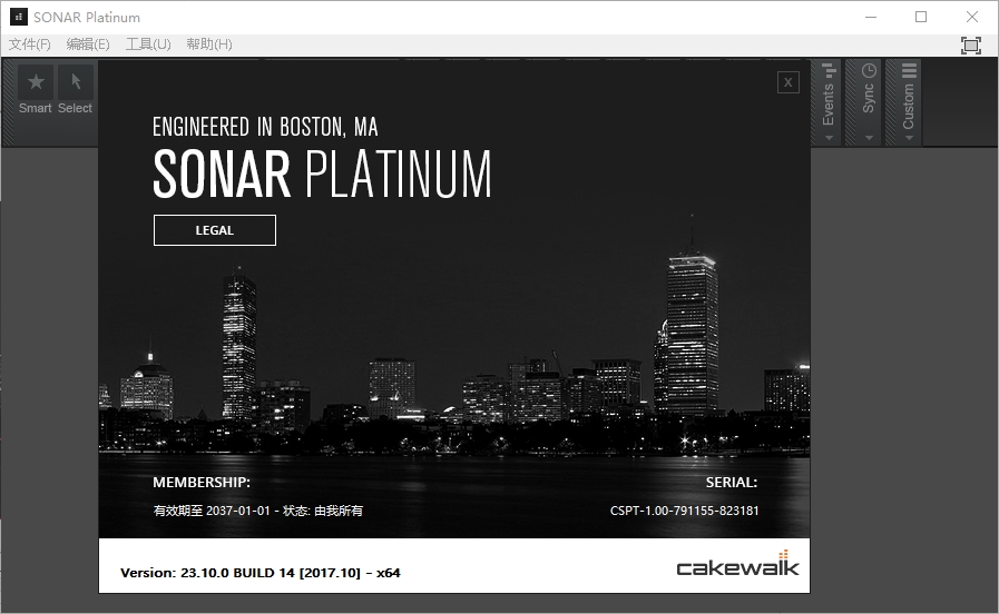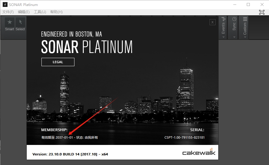8、以上操作都完成后回到电脑桌面双击运行“SONAR Platinum”,点击帮助——关于,发现激活成功,看到使用到期期限为2037.1.1!