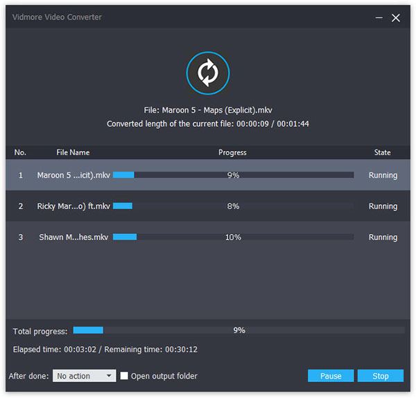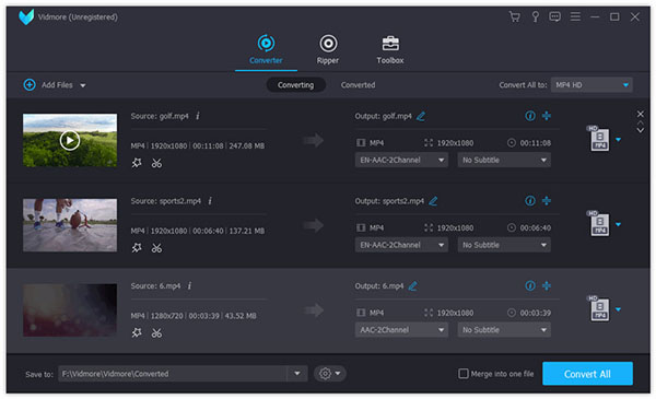 1、全面的4K支持 将4K UHD视频转换为任何设备的任何视频格式 2、1080p高清画质 以出色的画质将视频输出为1080p HD和720p HD 3、无损转码 享受最佳转码的好处,而不会降低质量 4、轻松调整质量 通过精心设计的内置设置优化输出配置文件 5、高速视频处理算法 Vidmore Video Converter可以将视频转换为4K / 1080p HD质量,速度提高50倍 6、硬件加速 支持NVIDIA CUDA,NVENC,Intel QSV和AMD APP的高级硬件加速,以实现快速的视频转换 7、多核处理器的优化 充分利用您的多核处理器来转换具有不同核心的视频文件,从而加速每个文件的转换Vidmore使用教程