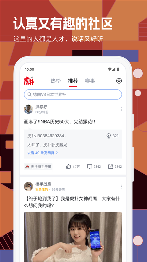 1、[与偶像近距离互动] 在虎扑,经常有各领域(娱乐圈、NBA、CBA、游戏主播等等)的艺人&大神会前来与大家分享生活点滴。章若楠、宋欣冉、吴克群、徐冬冬、李佳航、成果、黄渤、张天爱、景甜、陈钰琪、李一桐、庆余年剧组、库里、林书豪、郭艾伦,数百明星艺人都在虎扑接受JRs的拷问!在虎扑表达不一样的那一面。想要知道他们的日常生活,和自己的偶像亲密接触,提出台前幕后的花絮问题?「终于轮到我了」满足你的愿望! 2、[个性化兴趣亮回复社区,共享人生经验,让你成长] 在「体育版块」,获取真实客观的资讯,和你的主队一起战斗; 在「步行街」观世间百态,听肺腑之言,体验精彩的人生,极容易上瘾,请控制时间; 在「影视区」聊电影,写影评,为影视作品表态,不为资本折腰,用值说话,避免陷坑; 在「数码区」通过大神攻略去得到真正适合你的数码神器; 在「车友交流」和大神交流,买车前先问问老司机; 最精彩的还是「亮回复」,打开虎扑亮评区,还你一个段子世界,大神网友机智神评论,抖机灵、恶搞梗、神补刀、人生经验,好玩有用回复刷到停不下来! 3、[感受电竞氛围,学操作攻略] 虎扑是一个热闹的电竞社区。在这里你可以获取大量的一手游戏资讯,与百万游戏迷共享自己的竞技态度和游戏人生!在这里,你可以与众多玩家们讨论游戏心得、分享比赛见解,更有职业战队、顶级主播、天梯大神常驻做客,与大家真诚交流,手把手教你玩转游戏。 4、[看赛事直播,聊比赛,晒装备] 获得关于篮球、足球、游戏电竞的海量内容:看各种赛事的新闻、直播、视频、数据更新日志