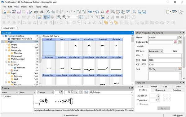 FontCreator Pro是一款业又好用的字体制作设计工具,软件不仅占用内存小巧,界面直观友好,还结合众多普通字体创建软件功能、以及各种智能选项、COLR和SVG颜色扩展、强大的脚本转换等多样化专业、先进的功能模式于一体,可让广大用户们可以通过扫描的图像或者是自己手写的笔迹来进行字体制作,使用起来更加简单,方便之外。还支持您修复字符代码点、字体名称、字形名称和字距调整对,随时在安装前预览字体,甚至可以通过定义轴和轮廓层来制作可变字体等操作,从而让你轻松创造出独一无二的字体作品。FontCreator Pro在操作和功能系统方面做到了全面的升级优化,例如新增了可变字体、可停靠面板、 改进了OpenType 布局功能的交互式打样、基于统一字体对象 (UFO) 字体的导入和导出、以及高DPI支持等等。并且还提供了人性化的操作设计模式,支持一键添加缺少的字符,修正字符映射,从而给于每一位用户最佳、最专业的使用效果体验!