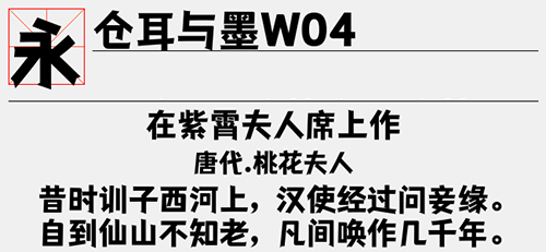 仓耳与墨w04字体是一款赏心悦目、百看不厌的中文字体,该字体笔触较为较粗,书写流畅。该字体不仅将篆刻的“刀意”融入其中了,同时还为中和这种“尖锐”,在转折和“口”字结构上使用圆转角的处理方法,让整个字内方外圆,整体效果极佳,并且中英文、阿拉伯数字全面支持。可以很好的应用于文本装潢、信息展示、网页设计、篆刻制模、数据制作、装潢设计、计算艺术设计、视觉设计、字帖等一切合法应用场景,有喜欢的朋友可免费下载收藏。