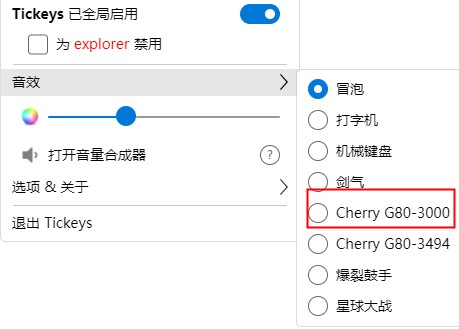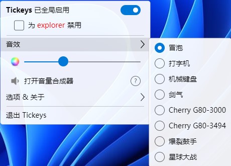 Tickeys键盘音效软件是一款很强大的有趣的键盘音效工具。软件自带了四种声音效果方案,有打字机、冒泡、机械键盘、剑气等。每天都听着键盘声音是不是很烦闷,拥有这款神器你就可以瞬间帮助自己的键盘加上逼格特效。除了复古的「打字机」模式,新增了「爆裂鼓手」模式,欢快动感,简直将码字变为一场架子鼓独奏。值得一提的是除了机械键盘的音效外,开发者还专门为 Cherry 的 G80 3000 与 G80 3494 两款键盘配置了音效。其他效果大家可以都尝试一遍。一般来说,回车键、退格键、空格键、方向键会有区别于常规字母按键的声音,连续敲起来比较有趣,不用担心过于单调。每个声音方案的音调和音量也都可以自行调节。3322网提供下载,欢迎使用!