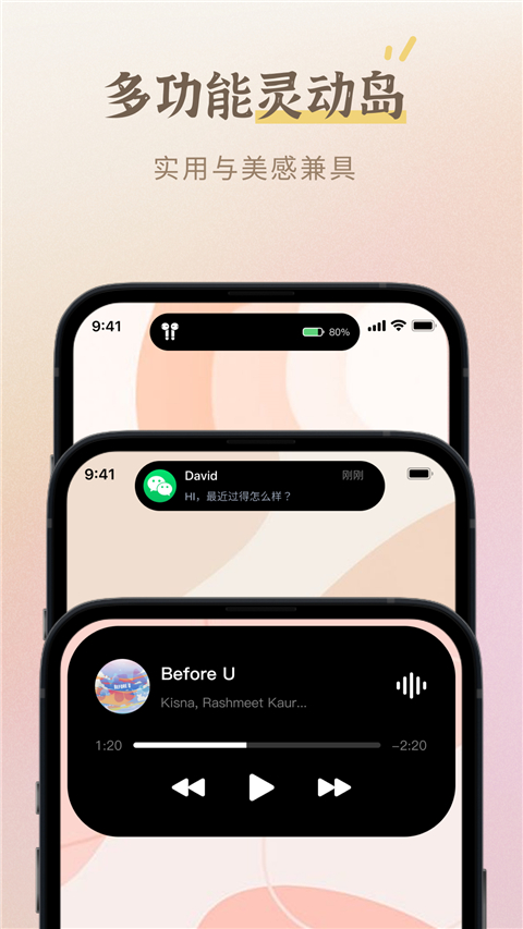 1、灵动岛功能 在Android设备上即可体验灵动岛功能,当您的设备充电、消息通知、播放音乐时,可以通过灵动岛的形式更好地提醒您。 2、自定义耳机弹窗 我们支持市面上所有耳机型号,并且您可以导入视频和图片,随心DIY您的耳机连接弹窗! 3、充电动画 我们提供了多种有趣的充电动画,替换原有的系统充电效果,让您的充电过程更加有趣!小组件盒子app自定义耳机弹窗动画教程