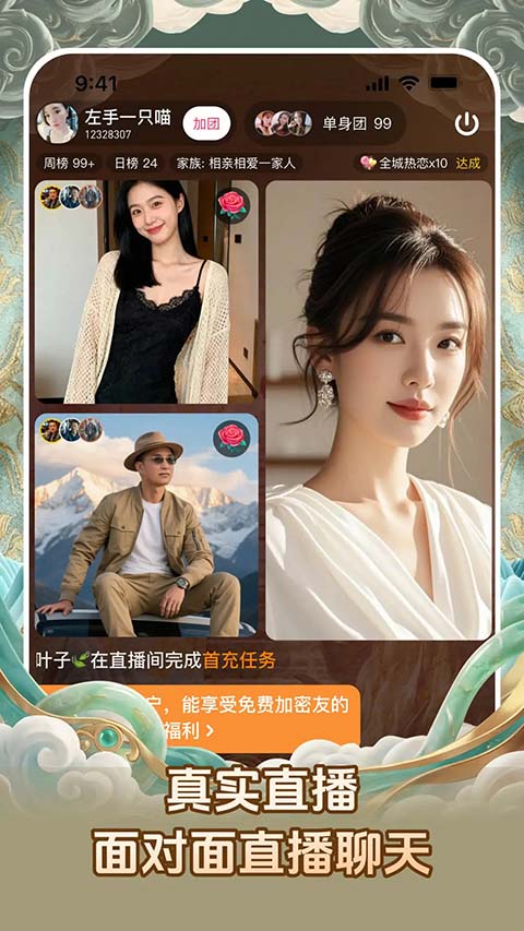 1、视频相亲功能,用户可以在平台里与匹配相亲,让双方都能够最真实的了解彼此 2、真人验证功能,通过视频相亲成功后,可以线下约见,让用户能够增加脱单的几率 3、点赞功能,对于喜欢的异性聊天对象,可以在TA的主页进行点赞,表明你的心意 4、推荐功能,平台会根据你的情况智能为你匹配到漂亮的小姐姐,助你早日脱单 5、语音聊天功能,可以让比较腼腆的用户进行使用,让他们在这里也能找到属于自己的那个TA 6、动态功能,每个用户都可以把自己的精美照片发布上去,让你的动态更加的多姿多彩更新日志