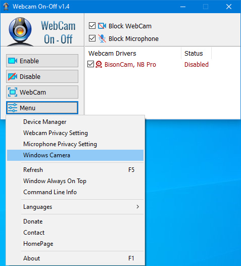 2、要禁用您的网络摄像头,请单击“禁用”按钮以安全地关闭您的网络摄像头并阻止应用程序访问摄像头。如果您的网络摄像头被禁用,文本和指示器图标将变为红色。您还可以勾选“阻止麦克风”框并同时禁用网络摄像头和麦克风,以防止未经您许可而打开它们。