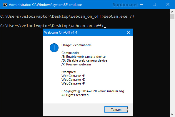 2、WebCam On-Off支持命令行的操作方式,打开命令行进入到 WebCam On-Off所在的目录中,关闭的命令是「Start WebCam.exe /OFF」,而开启的命令则是「Start WebCam.exe /ON」。