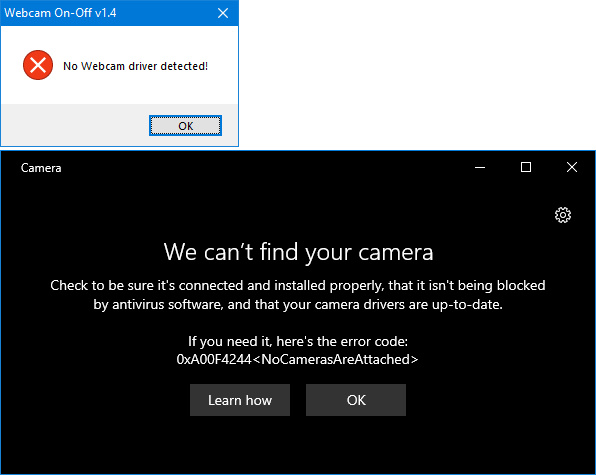 要再次启用它/它们,请单击“启用”按钮。禁用网络摄像头后,您可以在通常使用它的应用程序中检查其状态。您应该看到“未检测到网络摄像头驱动程序”错误。您还可以通过Windows 相机应用程序检查您的相机,只需在搜索框中输入相机或使用菜单 – Windows Camera Link。将出现错误消息“我们找不到您的相机”