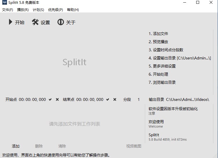 2、SplitIt的使用非常简单,根据软件提供的向导、首先添加文件或任务列表、然后使用内置的播放器浏览内容、这可帮助用户更准确地把握切割位置定位、也支持鼠标拖放定位。使用时间点切割时、可以分别按开始点和结束点的选择按钮来快速定位、不设置时间点时、软件按分段数量分割、最后点击“开始”即可执行操作、相当方便、当发现重名文件时,SplitIt 可自动改名或覆盖设置。
