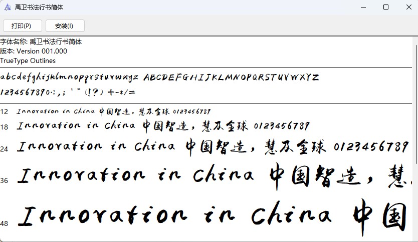 禹卫书法行书简体是国内知名文字创意人禹卫先生所开发的,其字形飘逸大方,极其富有艺术感,该字体都是GB_2312字库,包含了常用字和生僻字,被广泛运用于各种办公软件、QQ、MSN等常用聊天工具,像photoshop这种绘图软件也会使用到它。